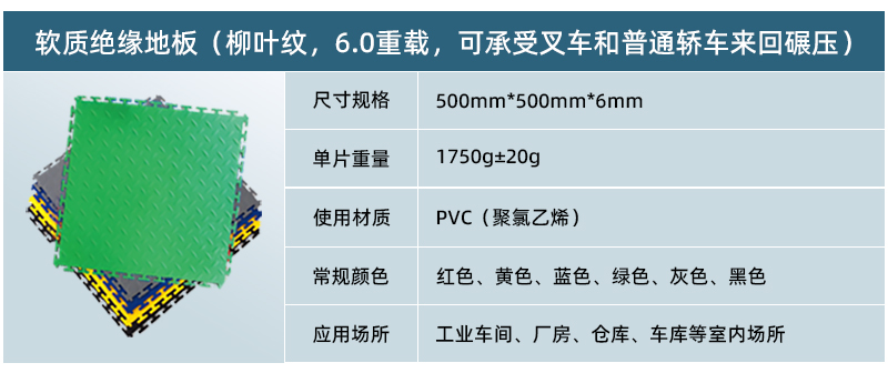 6、色彩絢,易搭配: 軟質(zhì)絕緣地板常規(guī)顏色為紅色、黃色、黑色、灰色、藍(lán)色、綠色等顏色,也可根據(jù)客戶的要求進(jìn)行色彩的調(diào)整。正方形